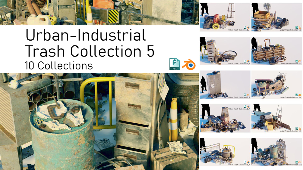 🔰All collections are created by combining 620+ Urban Trash Assets Complete Pack and 200+ Industrial Debris Scrap Trash 3d Models Pack