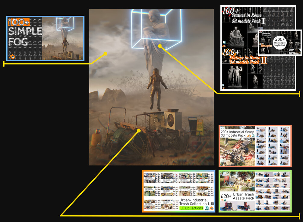 🔰All collections are created by combining 620+ Urban Trash Assets Complete Pack and 200+ Industrial Debris Scrap Trash 3d Models Pack