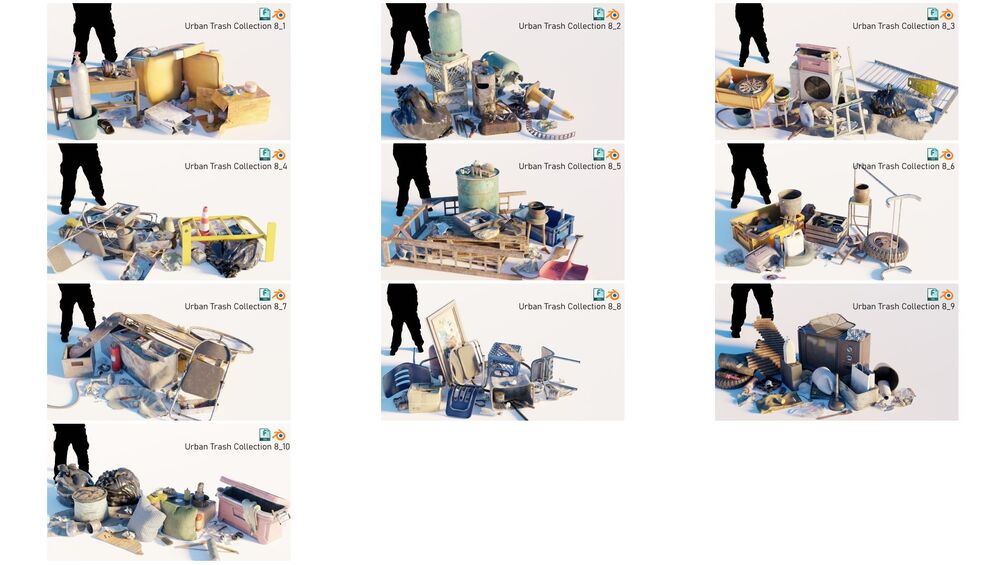 - 10 .blend files with 10 collections.(Trash, Waste, Scrap, Junk and Garbage)